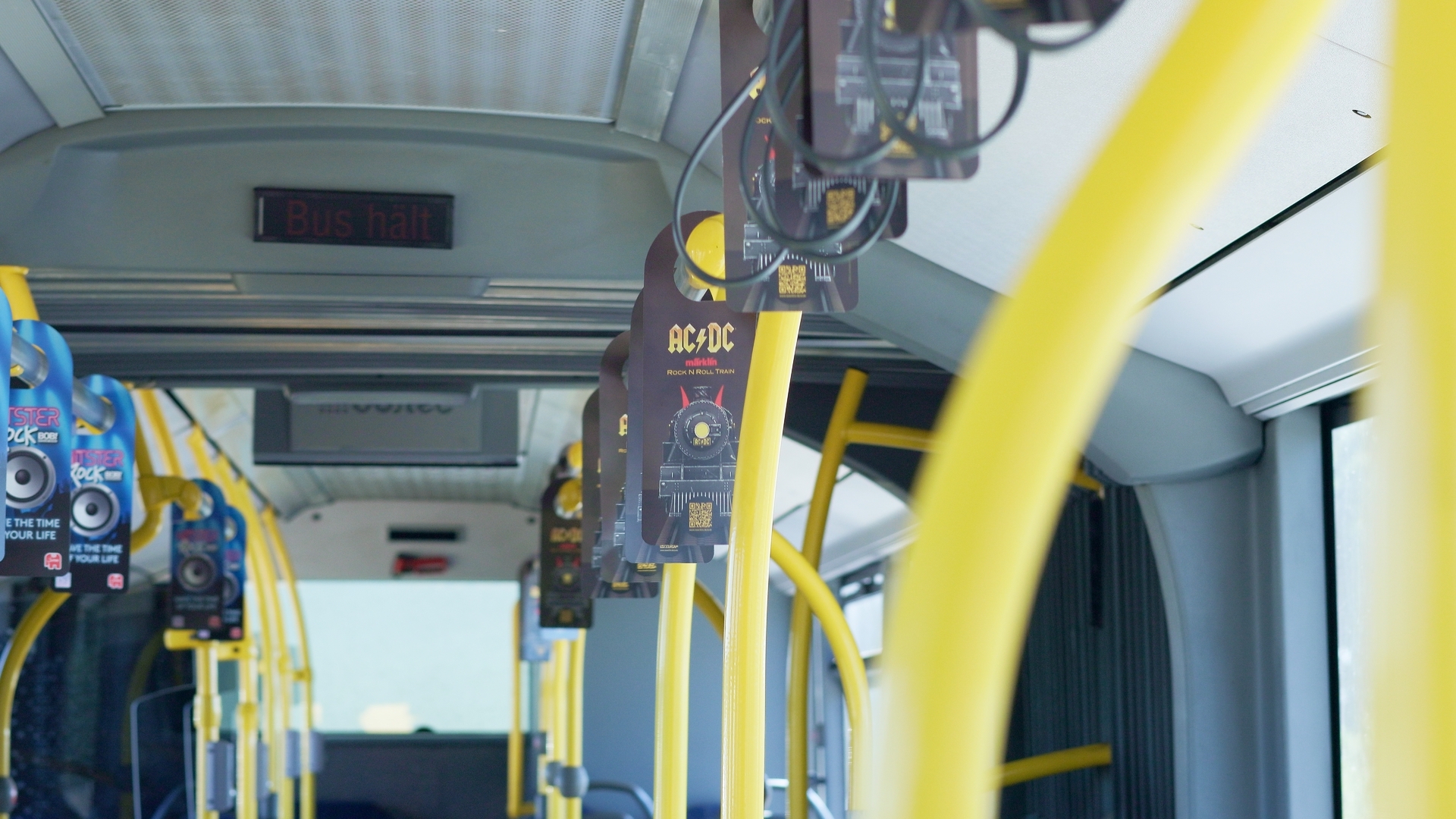 Auf einer Seite der Swing Cards, die an die Haltestangen im Bus gehängt wurden, präsentierte Märklin die neue „Black Ice Lok“ – ein originalgetreues Modell des legendären Rock’n’Roll-Trains, der als Bühnenelement bei AC/DC zum Einsatz kam. Die Lok ist Teil einer exklusiven, lizenzierten Märklin-Sonderedition zu Ehren der wohl größten Rockband der Welt.