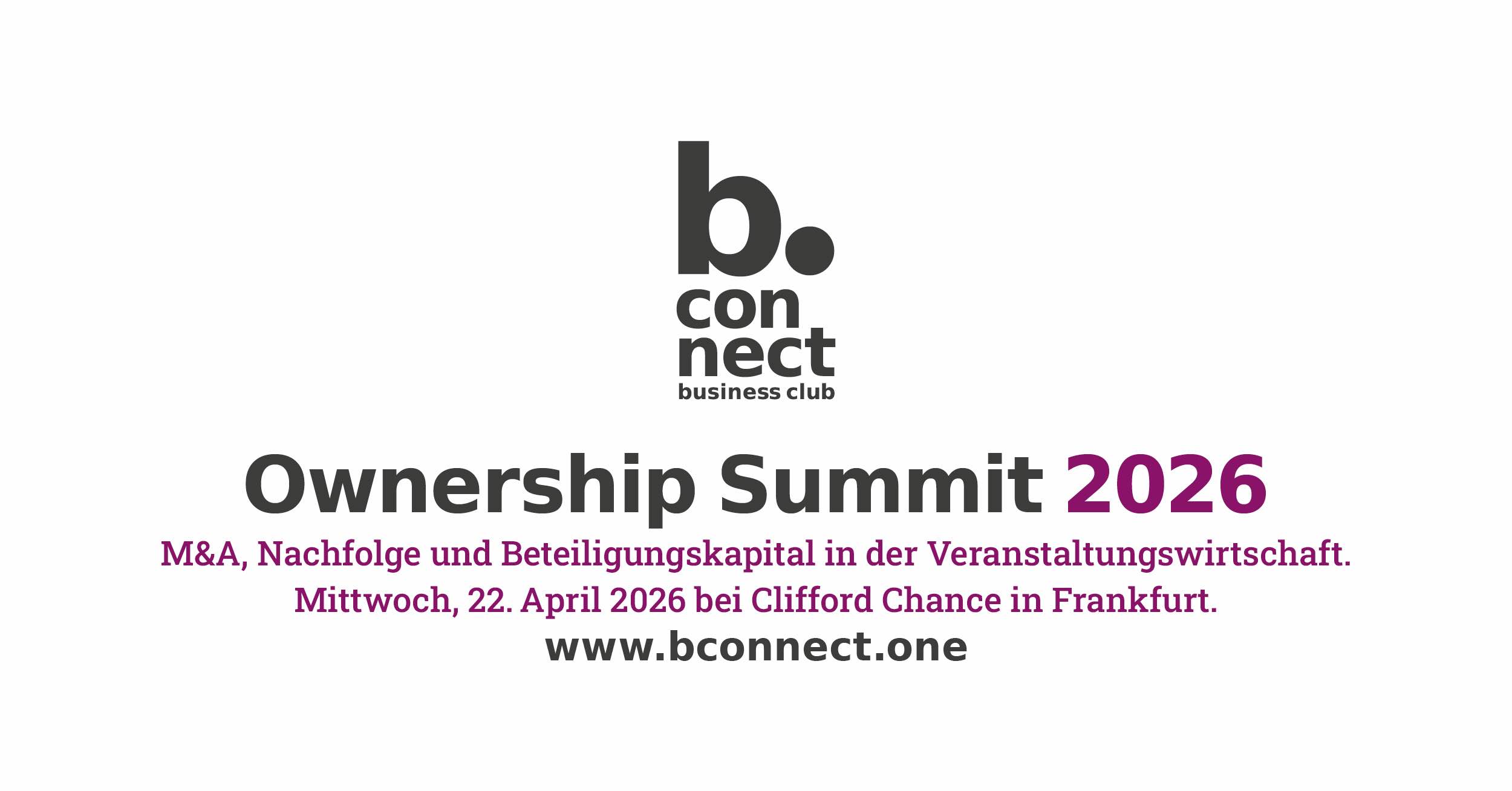 Vor diesem Hintergrund veranstaltet der Business Club b.connect am 22. April 2026 um 15 Uhr in Frankfurt erstmals den Ownership Summit. Unter dem Subhead „M&A, Nachfolge und Beteiligungskapital in der Veranstaltungswirtschaft“ bringt die Veranstaltung Branchenvertreter mit Investoren, Finanzierungspartnern und Juristen zusammen. Gastgeber ist die internationale Wirtschaftskanzlei Clifford Chance.