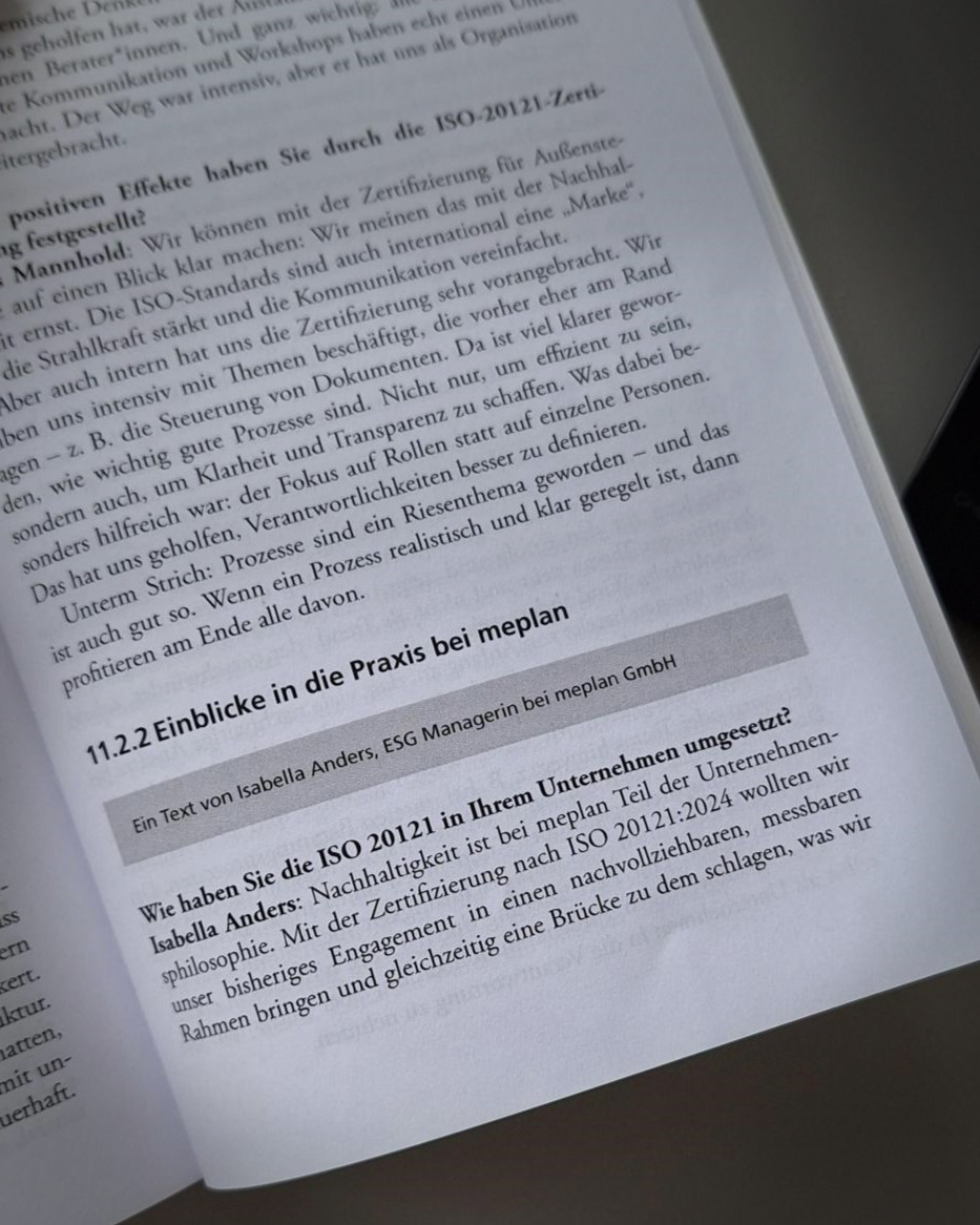 Die Agentur für Markenräume und Messebau ist in dem Guide mit einem Praxisbeitrag vertreten. ESG-Managerin Isabella Anders erläutert darin konkrete Erfahrungen aus der Umsetzung im Unternehmen und beschreibt Herausforderungen bei der Integration der Norm in bestehende Prozesse. Den Quick Guide ISO 20121 – Nachhaltigkeitsmanagement in der Veranstaltungsbranche gibt es hier: https://link.springer.cbook/10.1007/978-3-658-50333-8.