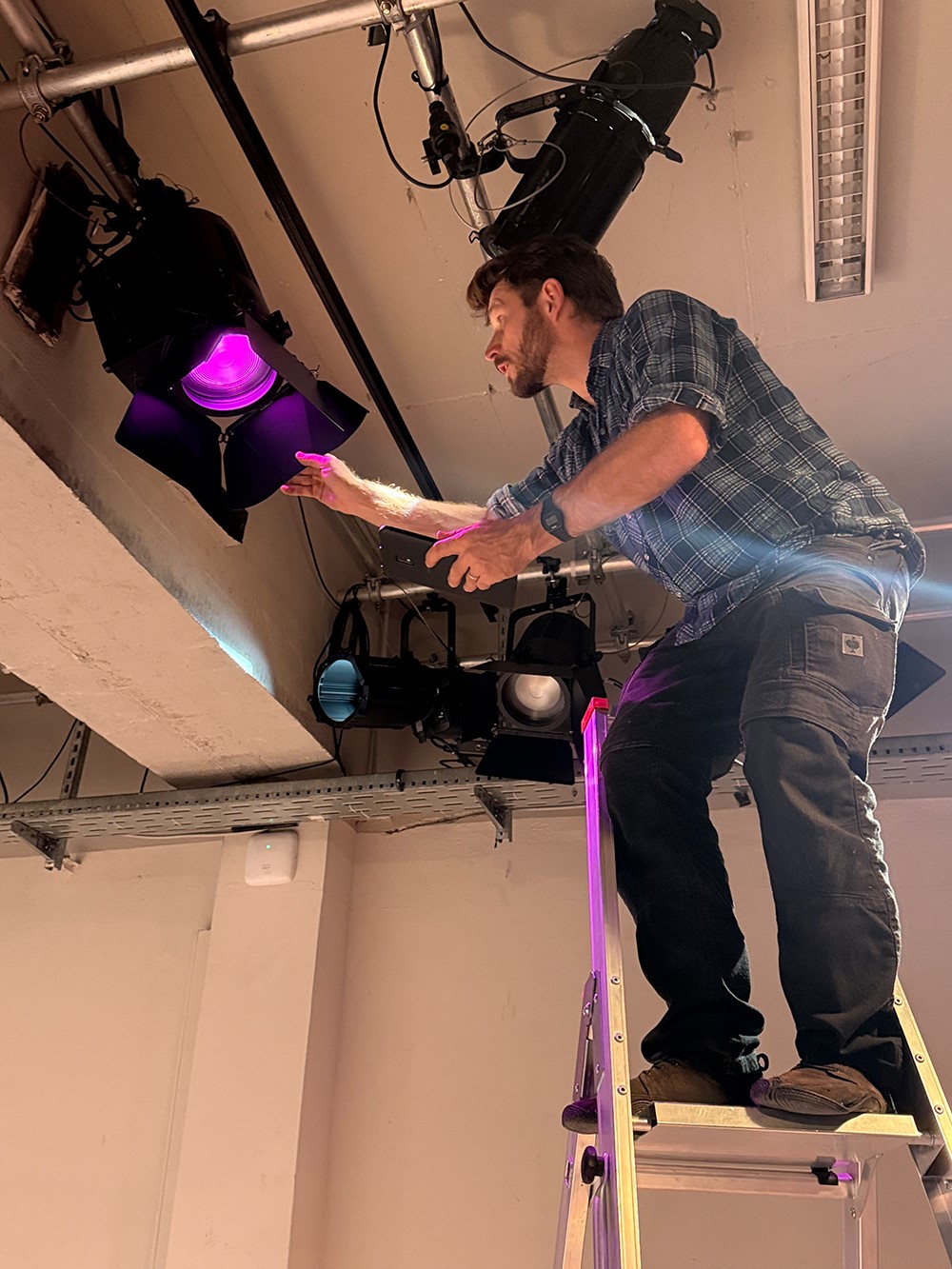 „Wir hatten vorher fast nur Halogen, mit Ausnahme einiger weniger farbiger Showlampen“, berichtet Stephan Mäusel, der sich die Stelle des technischen Leiters mit David Ojala teilt. „Mit Hilfe von Fördermitteln konnten wir nun unser komplettes Grundlicht auf LED umstellen. In Zukunft wollen wir das TD vollständig auf LED-Beleuchtung umstellen.“