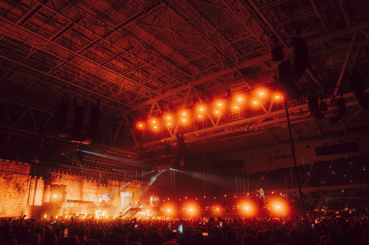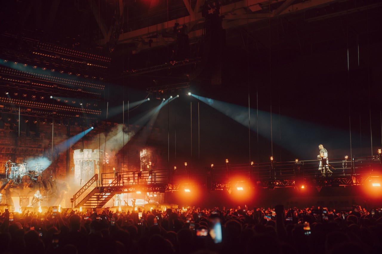 Die Hauptbühne war als imposante Burgkonstruktion ausgeführt, rund 20 Meter breit und auf etwa zwei Metern Höhe angelegt. Im hinteren Bereich der Bühne befand sich zusätzlich ein Balkon auf circa vier Metern Höhe, der in die szenische Gestaltung eingebunden war. Ergänzt wurde das Setup durch eine B-Stage am FOH mit einer Grundfläche von 4,60 × 4,60 Metern und einer Höhe von 2,20 Metern, die in einem Abstand von rund 28 Metern zur Hauptbühne positioniert war. Beide Bühnen konnten über einen geflogenen Laufsteg miteinander verbunden werden, der auf einer Höhe von etwa 3,60 Metern verlief. Darüber hinaus gab es Szenen, bei denen sich die Band durch das Publikum bewegte und somit auch der Publikumsbereich aktiv in das Showgeschehen integriert werden musste – alles in allem eine komplexe Aufgabe für das Tracking-System und den verantwortlichen Techniker.