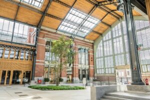 Ebenfalls nachhaltig renoviert wurde das im Jahr 1907 erbaute Hôtel des Douanes (tour-taxis.com/event-space/hotel-des-douanes). Bei der Sanierung des historischen Zollhauses hat der Bauherr umweltfreundliche Techniken wie geothermische Heizung und Kühlung sowie die Möglichkeit zur Nutzung von Regenwasser integriert. Der Erhalt wesentlicher Bauelemente wie Granittreppen und Stahlkonstruktionen unterstützt dabei die Prinzipien der Kreislaufwirtschaft. Heute trägt das Gebäude zur nachhaltigen Revitalisierung des Tour & Taxis-Geländes bei.